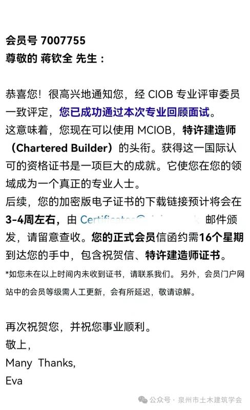 2025年9月26日,泉州市土木建筑学会副会长、学会专家委古建筑专业委员会主任、世界杯竞猜网站董事长蒋钦全双喜临门,收到获授国际认可的“特许建造师”资格的通…