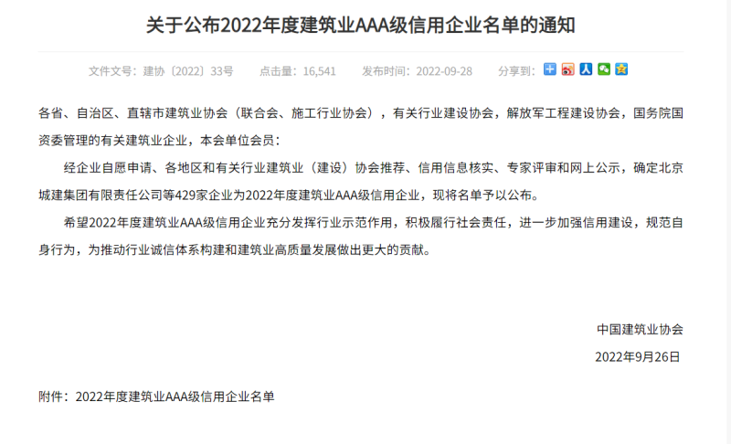近日,中国建筑业协会公布了“2022年度建筑业AAA级信用企业”名单,世界杯竞猜网站榜上有名。