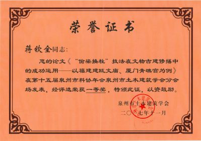 我司蒋钦全董事长论文《“偷梁换柱”技法在文物古建修缮中的成功运用—以福建建瓯文庙、厦门青礁宫为例》在第十五届泉州市科协年会泉州市土木建筑学会分会场发表,经评荣获一…