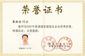 2017年10月,公司获评“泉州市建筑业先进企业”,董事长蒋钦全荣获“泉州市建筑业优秀项目经理”,张清波荣获“泉州市建筑业优秀经理”。