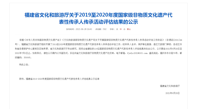 依据《中华人民共和国非物质文化遗产法》《文化和旅游部非物质文化遗产司关于开展国家级非物质文化遗产代表性传承人传承活动评估工作的函》(非遗函[2021]44号),福建省文化和旅游厅组织开展了2019至2020年度国家级非物质文化遗产代表性传承人传承活动评估工作。