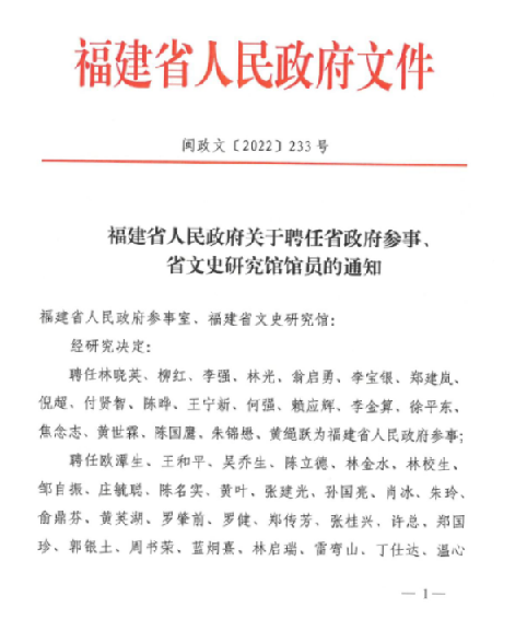 近日,福建省人民政府发布《福建省人民政府关于聘任省政府参事、省文史研究馆馆员的通知》,协会常务理事蒋钦全(国家级非遗传承人,世界杯竞猜网站董事长)被聘为福建省文史研究馆馆员。