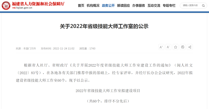 根据省人社厅、省财政厅《关于开展2022年度省级技能大师工作室建设工作的通知》(闽人社文〔2022〕83号),在各地各有关部门推荐申报的基础上,经专家评审,并经厅长办公会议研究,2022年拟建设省级技能大师工作室60个,现予以公示。