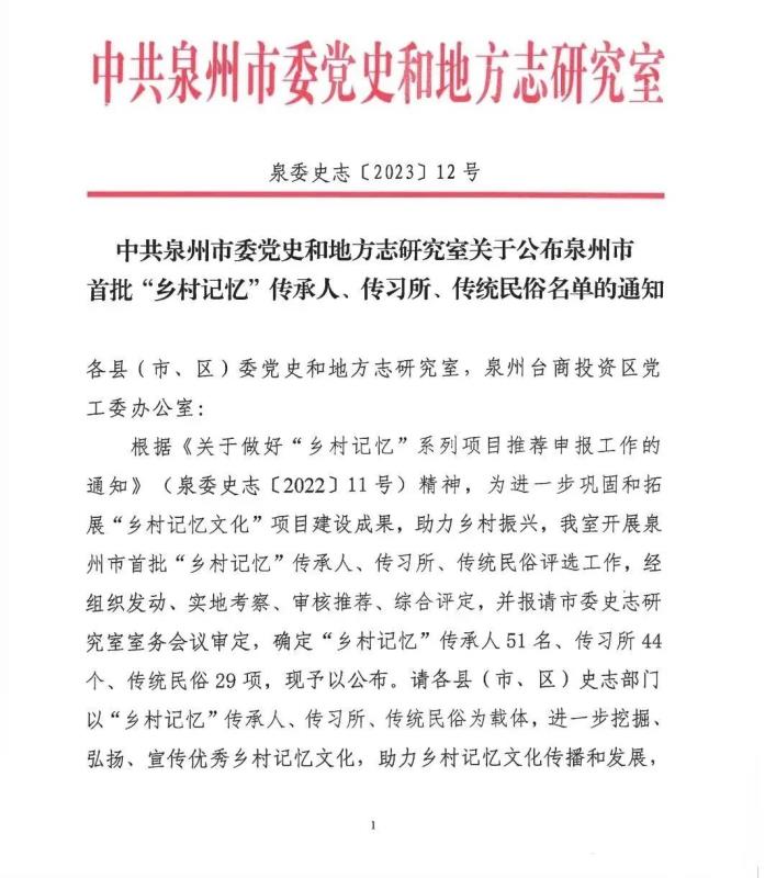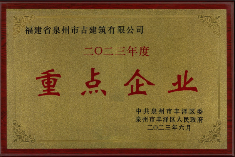 2011年6月公司法人被泉州市政府授予泉州市级非物质文化遗产项目“闽南传统民居营造技艺”代表性传承人,同时公司被授予“泉州市闽南传统民居营造技艺”传习所。