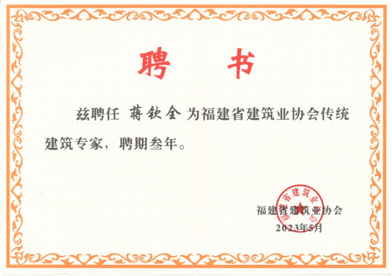 5月12日,福建省建筑业协会传统建筑分会在建筑之乡惠安正式成立,国家级非物质文化遗产代表性项目“闽南传统古民居营造技艺”代表性传承人蒋钦全担任首任会长。