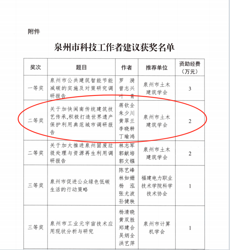 2017年11月14日,泉州市土木建筑学会第六届学术年会召开,我司荣获土木学会先进企业荣誉称号,董事长蒋钦全荣获土木学会先进个人,论文《“偷梁换柱”技法在文物古建修缮中的成功运用——以福建建瓯文庙、厦门青礁宫为例》荣获一等奖。