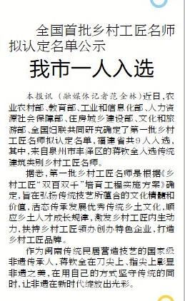 近日,农业农村部、教育部、工业和信息化部、人力资源社会保障部、住房城乡建设部、文化和旅游部、全国妇联共同研究确定了第一批乡村工匠名师拟认定名单,福建省共9人入选,其中,来自泉州市丰泽区的蒋钦全入选传统建筑类别乡村工匠名师。