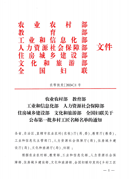 农业农村部、教育部、工业和信息化部、人力资源社会保障部、住房城乡建设部、文化和旅游部、全国妇联关于公布第一批乡村工匠名师名单