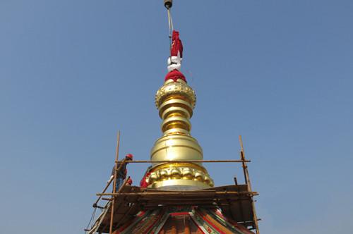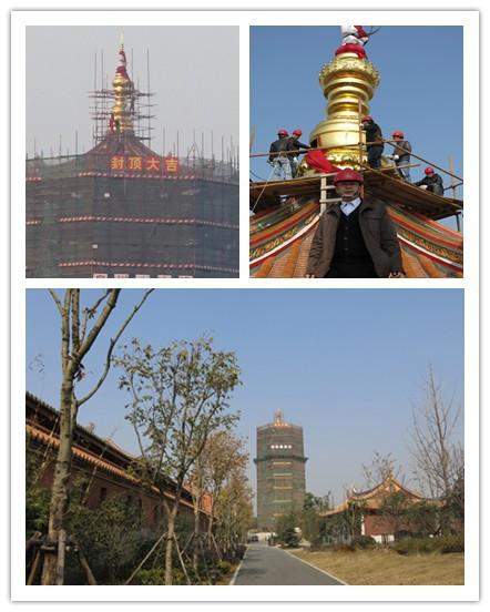 2014年12月29日,阳光明媚,碧空如洗,我司于江苏昆山营建中的慧聚寺万佛塔塔刹成功安装。公司蒋钦全董事长亲临现场,并登上塔顶指挥。