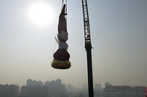 公司蒋钦全董事长为认真检查、指挥安装现场,特别钻进了塔刹。