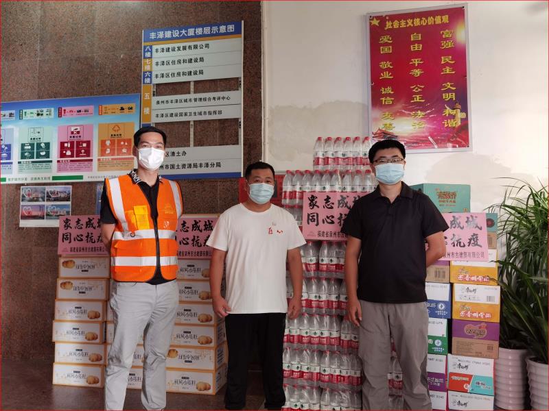 当得知丰泽区需要支援抗疫物资的消息,公司董事长、总经理立刻通知办公室积极配合准备。9月22日一早,公司常务副总李泽平带领工作人员,将矿泉水、蛋糕、泡面等抗疫物资送到丰泽区住建局,以便调配到有需要的抗疫工作处。