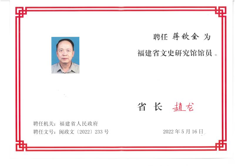 董事长蒋钦全受聘为福建省文史研究馆馆员