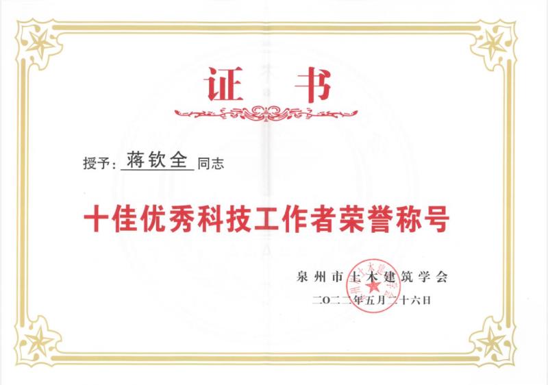 董事长蒋钦全荣获“十佳优秀科技工作者”荣誉称号