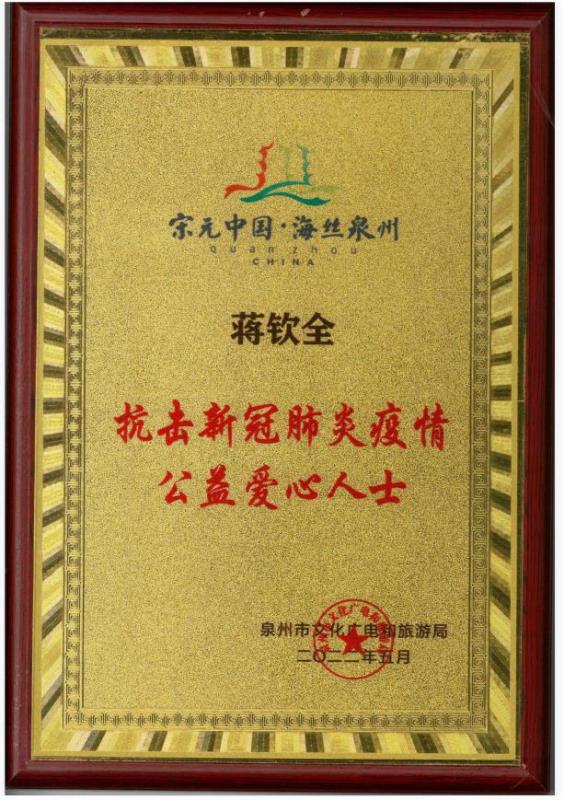 董事长蒋钦全获得:宋元中国-海丝泉州 抗击新光肺炎疫情公益爱心人士