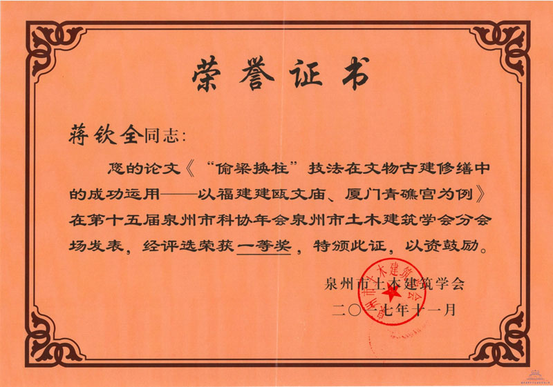论文《“偷梁换柱”技法在文物古建修缮中的成功运用—以福建建瓯文庙、厦门青礁宫为例》荣获一等奖。